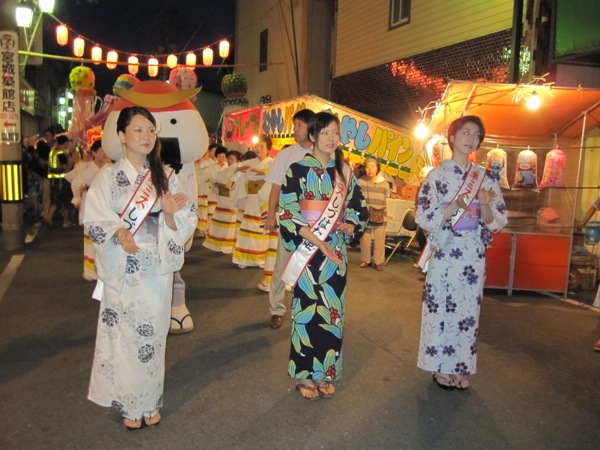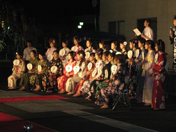 平日だし、仙台七夕の前夜祭と日にち重なってるし、まぁ例年通りかなと思ってたのですが…。 確かにこのブログにも出場者募集を書いたり、ホームページを作ったりはしました。チラシも目立つようにと少しサイズを大きくしました。でもまさかあんなにたくさんの出場応募が来るなんて…。 2年前に応募者多数だった時には開始時間を繰り上げて時間延長でなんとかしましたが、平日という事もあり、開始時間の繰上げもできないし、仮にしても一人一人のアピールタイムを短くしなければならないという事で、やむを得ず一次審査で25名まで絞りました。 そんな多数の中から絞られた方々だから、本選の審査も難航 ほぼ全員が「ミス」クラスですから。来年も応募が多数になってしまうかもしれませんが、本当に惜しくも受賞とならなかった今年の出場者、一次審査通過ならなかった方も含めて、さらに磨きをかけてまた応募して頂きたいです。 応募者も例年以上でしたが、観客の人数もすごかったです。今年だけのイレギュラーなのか、コンテストがここまでの知名度になったからなのかまだわかりませんが、これからも栗原市の名物となるよう、頑張っていきますので、是非、次回以降も見に来て下さい! ちなみに今回受賞した方々には「つきだて七夕まつり」の手踊りパレードに参加して頂き、宮城県の観光キャラクター「むすび丸」君と一緒に歩いて頂きました。 今後、11月3日に開催予定の「薬師まつり」において、ミスは「しづはた姫」に、準ミスは「侍女」に扮して藤原一族の行列に参加して頂きます。